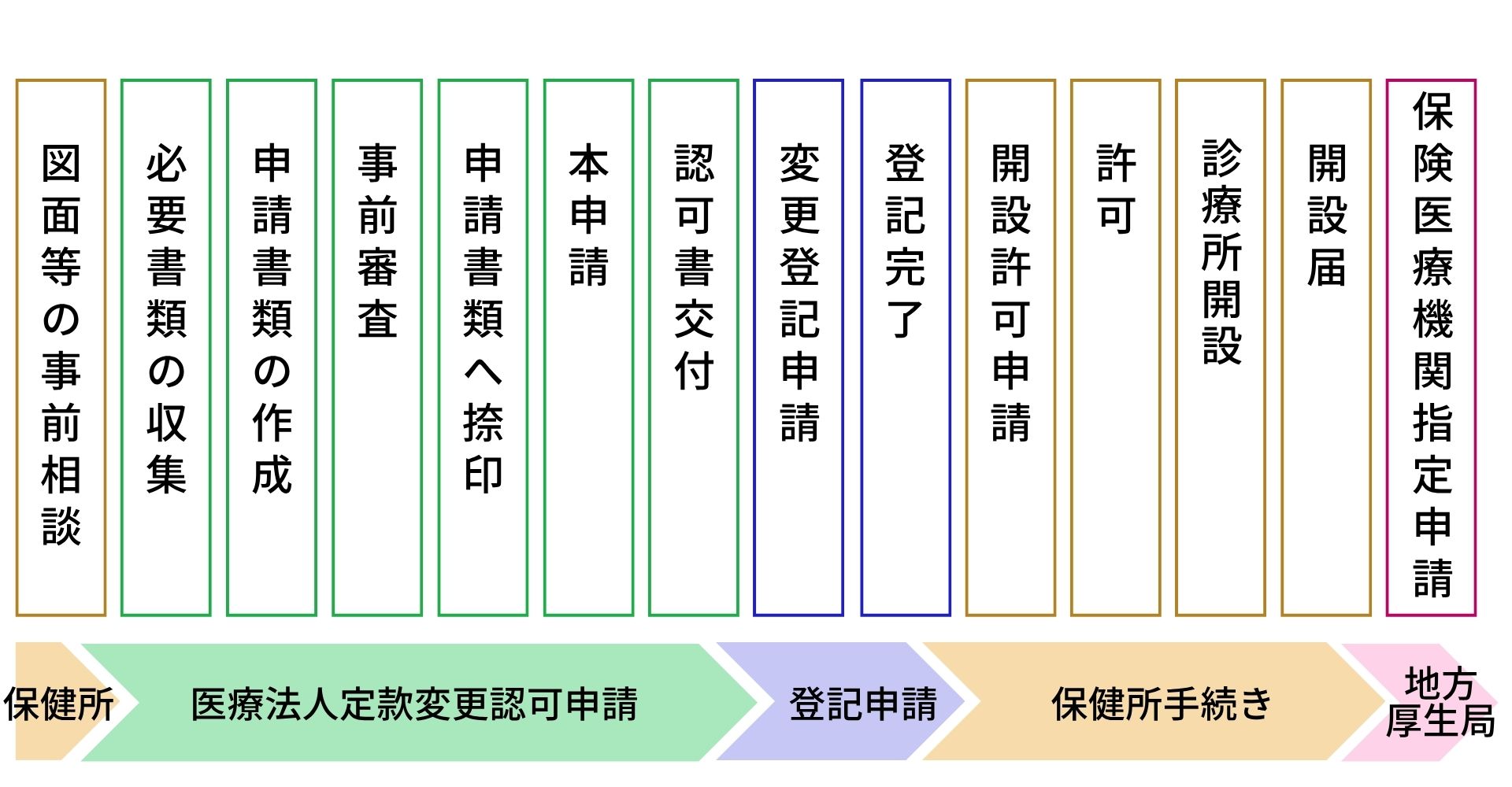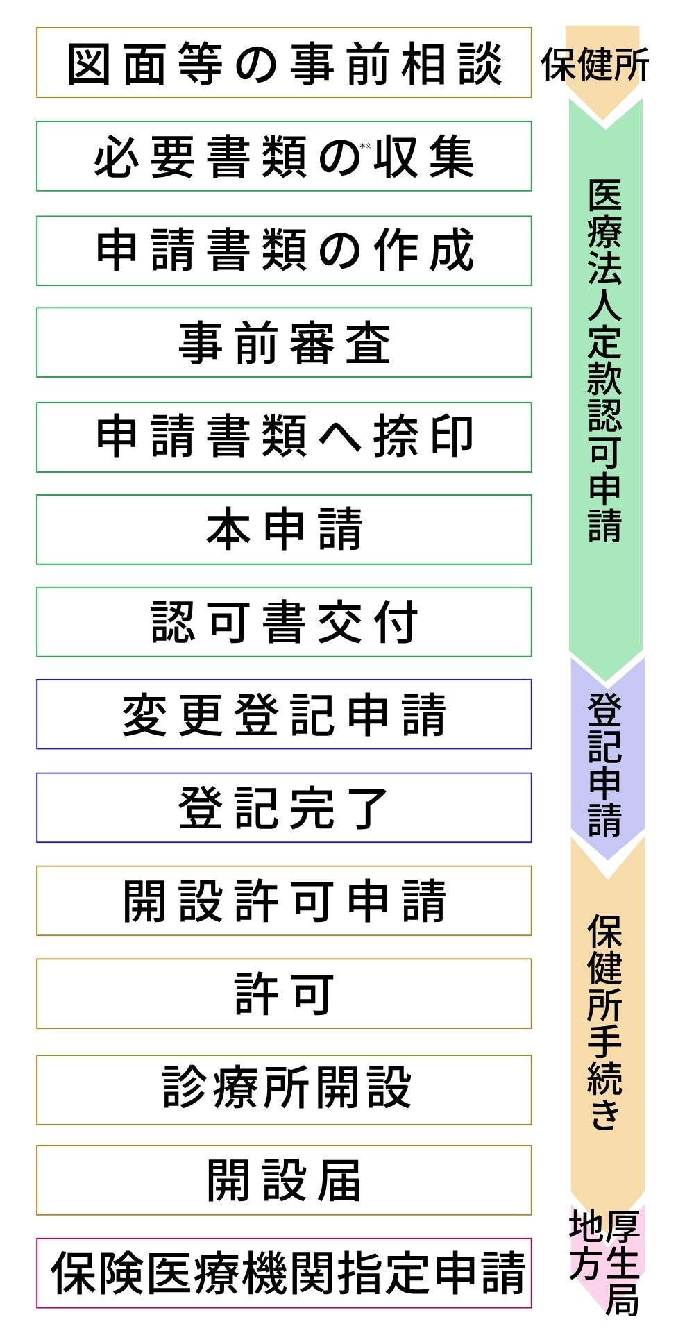 分院を開設するには、まず、都道府県の定款変更認可申請が必要となり、千葉県の場合、事前審査~認可まで最低2、3か月を要します。認可のあとは、法務局での変更登記を行い、保健所の開設手続きなど複数の手続きが続きます。