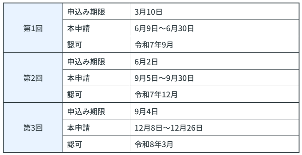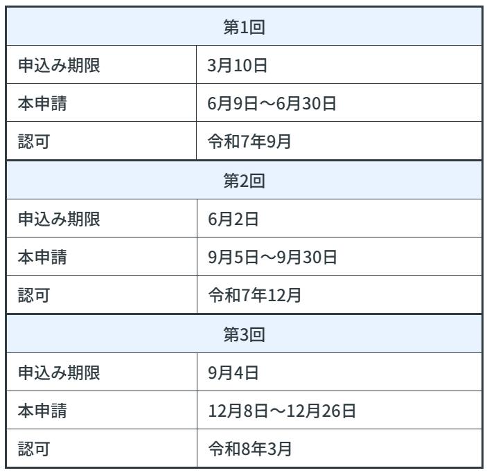 なお、認可申請をするには、所定の期日までに申し込みをする必要があります。